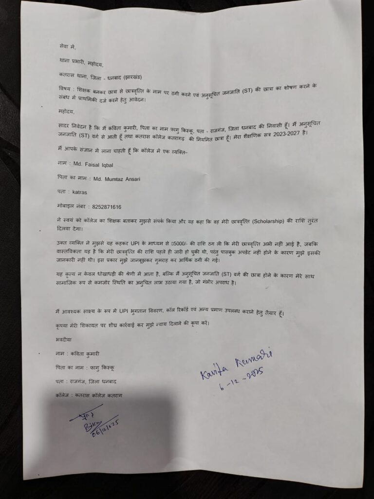 दी गई शिकायत में छात्रा ने लिखा है कि मैं कविता कुमारी पिता फागु किसको पता रायगंज जिला धनबाद के निवासी हूं। मैं अनुसूचित जनजाति एसटी वर्ग से आती हूं तथा कतरास कॉलेज कतरासगढ़ की नियमित छात्रा हूँ। आगे उन्होंने बताया कि फैजल इकबाल पिता मोहम्मद मुमताज अंसारी पता कतरास मोबाइल नंबर टेस्ट ने स्वयं को कॉलेज का शिक्षक बनकर मुझसे संपर्क किया और कहा कि वो मेरा छात्रवृत्ति का राशि तुंरत दिलवा देगा।