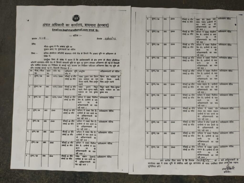 जारी नोटिस के अनुसार औसतन सभी कब्जाधारियों ने 30/30 फीट लंबाई, चौड़ाई में पक्का दुकान मकान का निर्माण कर लिया है। आसपास के ग्रामीणों से पता करने पर भी अधिकांश कब्जाधारियों के बारे में अंचल कार्यालय को कोई जानकारी नहीं लग पाई है। जारी नोटिस में लिखा है कि क्षेत्र भ्रमण के दौरान हॉस्पिटल कॉलोनी बाघमारा गोमो रोड के किनारे सरकारी जमीन पर कुल 19 दुकान बनाकर अतिक्रमण कर लिया गया है। जिसकी जांच संबंधित राजस्व उप निरीक्षक से कराई गई है। राजस्व उप निरीक्षक द्वारा प्लॉटवार अतिक्रमण की गई भूमि की जाँच रिपोर्टर उपलब्ध कराई गई है।