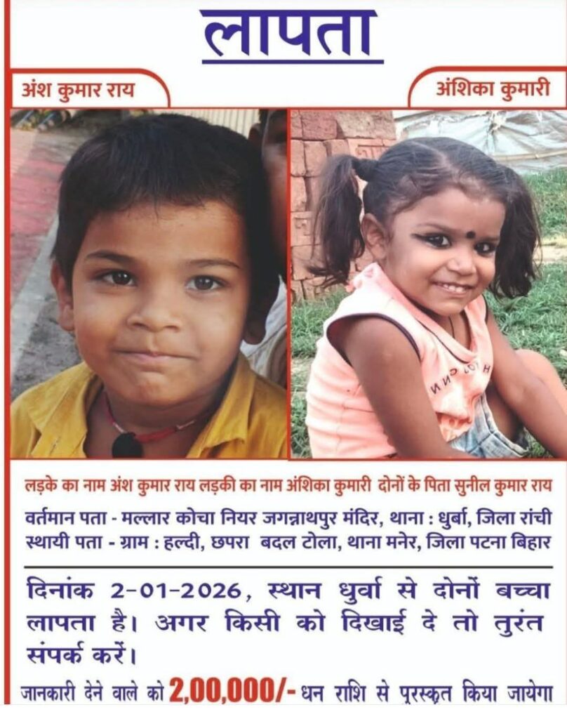 रांची। जगन्नाथपुर थाना क्षेत्र से 2 जनवरी से लापता दो बच्चों की खोज में जहां पुलिस-प्रशासन लगातार प्रयास कर रहा है, वहीं अब सोशल मीडिया पर एक चौंकाने वाली घोषणा सामने आई है।