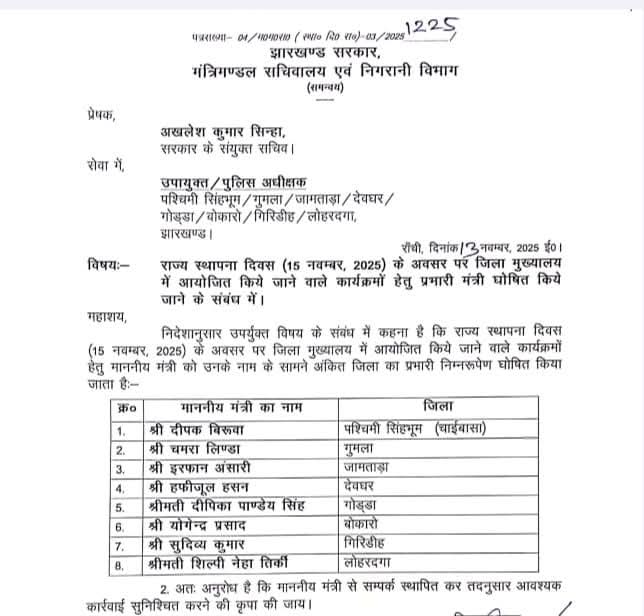रांची: झारखंड राज्य स्थापना दिवस (15 नवंबर) के अवसर पर सरकार की ओर से प्रदेशभर में भव्य कार्यक्रमों का आयोजन किया जा रहा है। इसके लिए मुख्यमंत्री की ओर से सभी मंत्रियों को अलग-अलग जिलों का प्रभारी बनाते हुए जिम्मेदारी सौंपी गई है। लेकिन इस सूची में दो नामों की अनुपस्थिति ने सियासी गलियारों में हलचल मचा दी है।